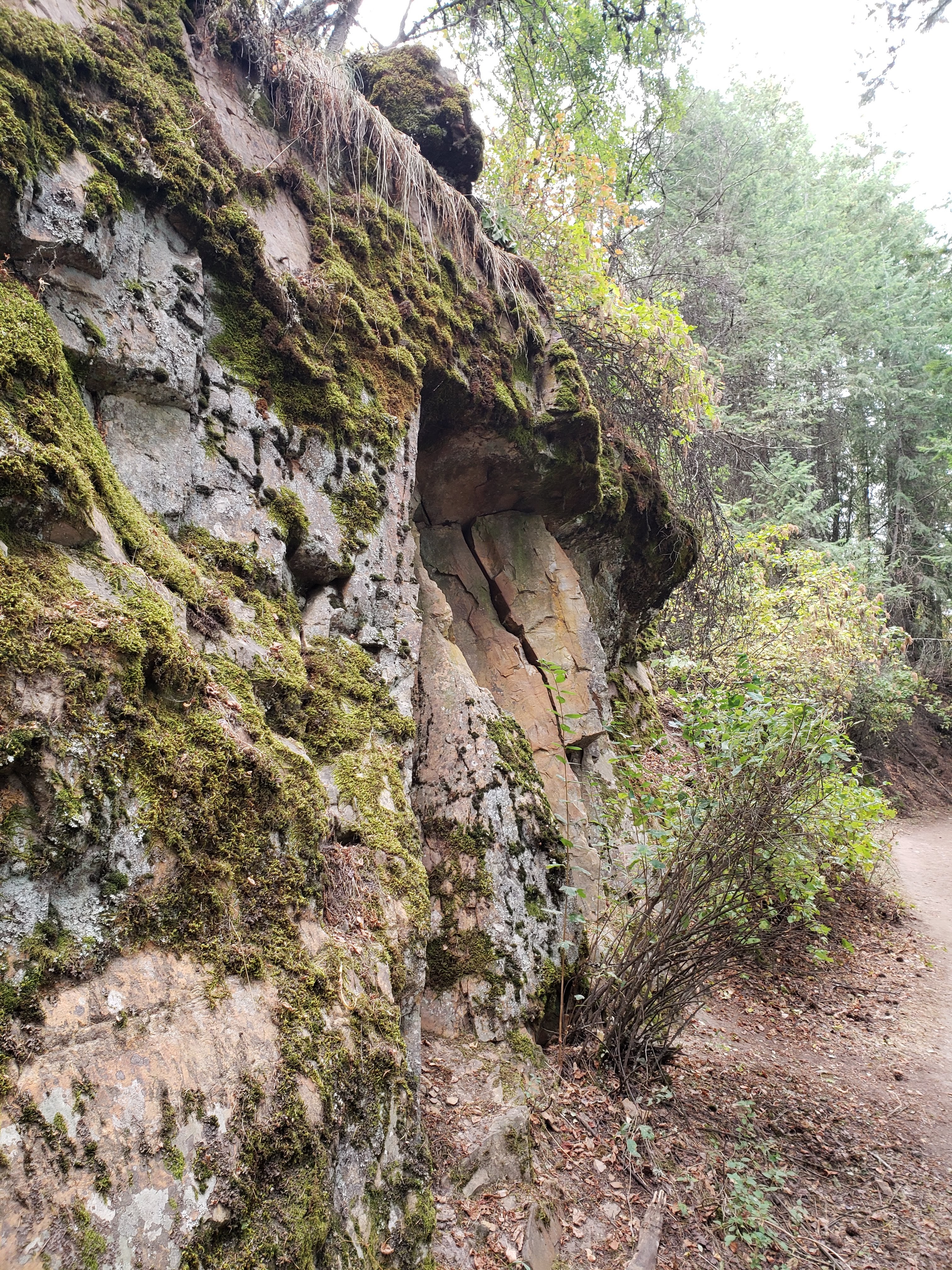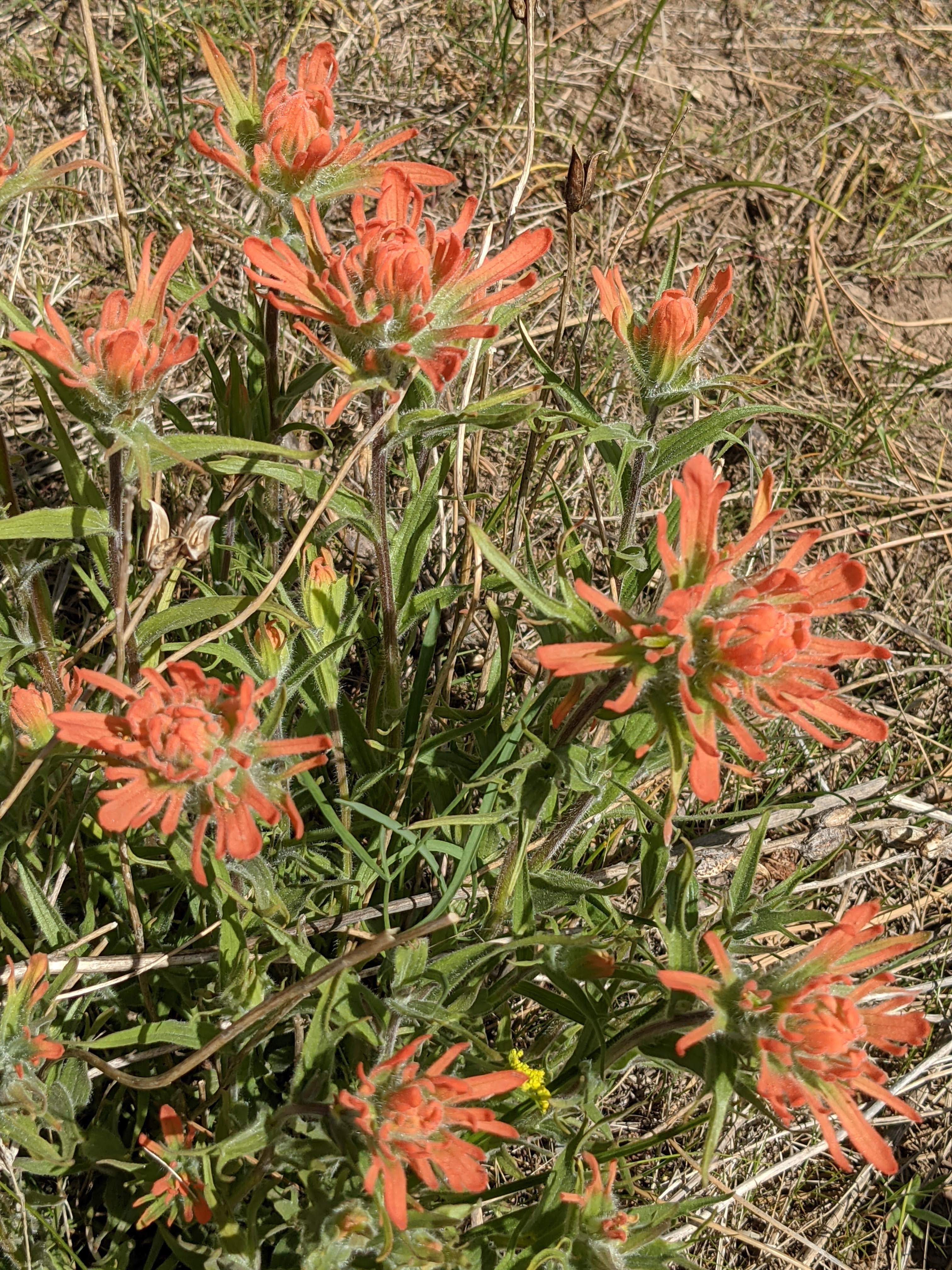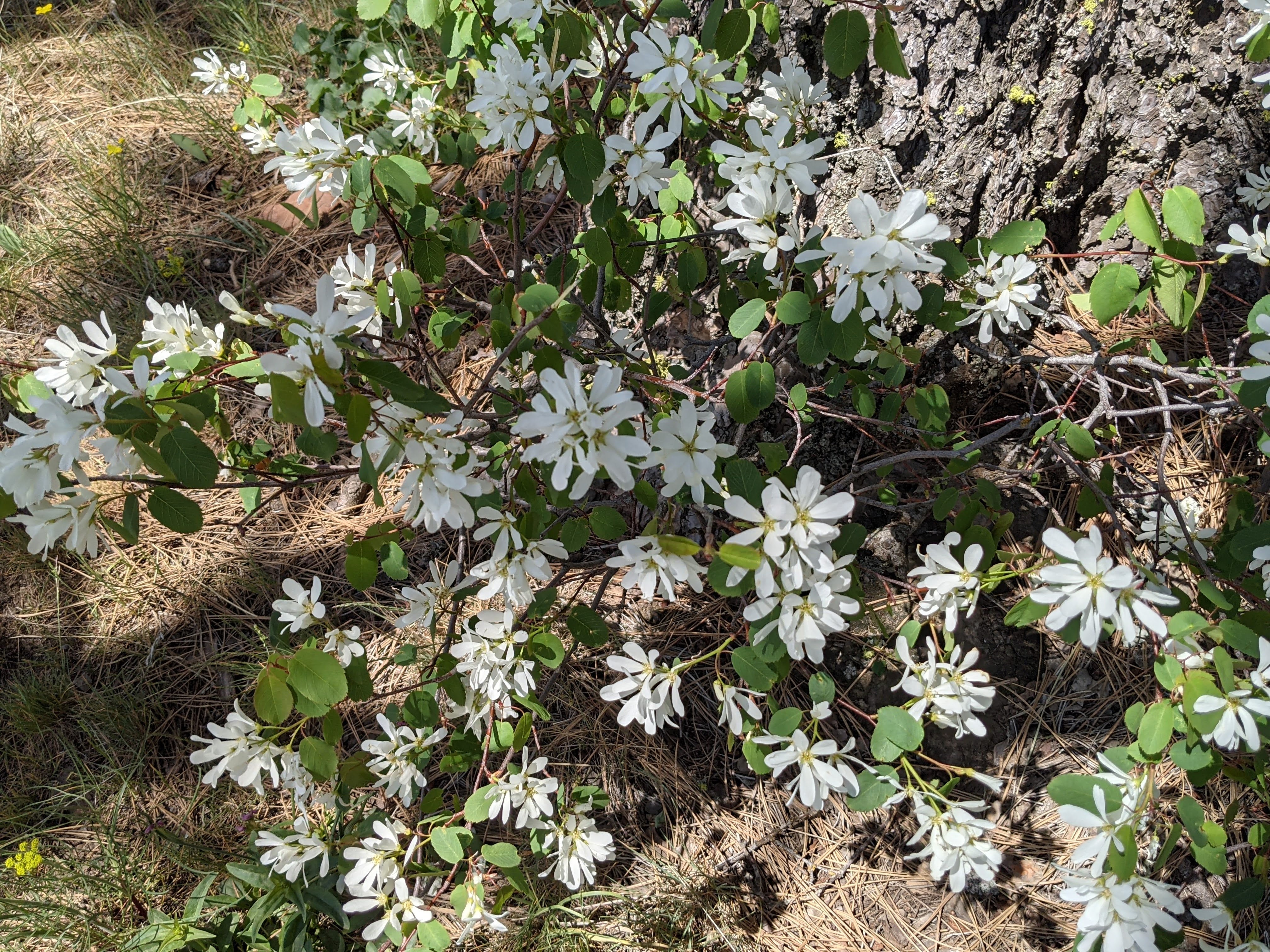 You can walk up the long, steadily sloping shady side, or take the short but steep walk from the parking lot (the signs direct you to take the steeper path first, and come back the long way). The middle, a gently sloping ridge along the top, has all the views. College students often set up a hammock along somewhere along the ridge.This rock looks like the face of an old Indian.I always look forward to passing beneath the arch created by this leaning tree.Shrubby white serviceberryIndian PaintbrushThere’s wonderful views from the butte in every season. Here’s a picture taken in fall.